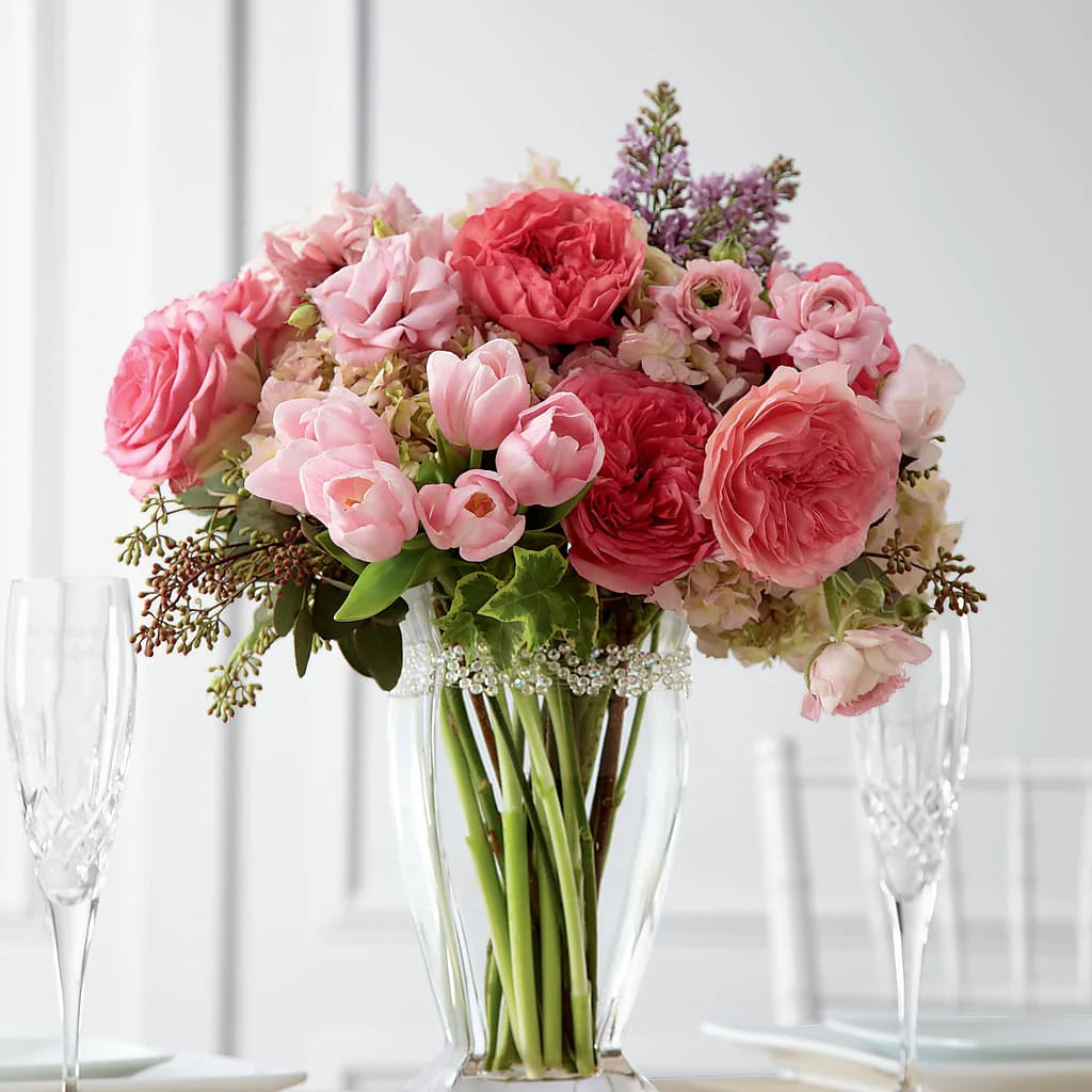 Our Abundant Array Arrangement is full of romantic intrigue and sweet beauty to offer its exquisite color and texture to your wedding celebration. Pink garden roses, ranunculus, tulips, and double lisianthus are accented with blush hydrangea, purple lilac, seeded eucalyptus, and variegated ivy, all gorgeously arranged in a tall clear glass vase to bring a special ambiance to your big day.