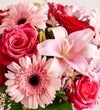 • All-around arrangement with red and hot pink roses, pink Asiatic lilies, Peruvian lilies (alstroemeria), Gerbera daisies and limonium; accented with assorted greenery