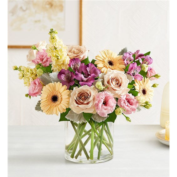 Our Charming Nature bouquet in shades of blush pink and creamy white brings all the charm of a rustic country garden to the people you care about. Cascading blooms are hand-gathered with lush greenery and designed in a clear cylinder vase, creating a beautiful gift that delights with every detail. • All-around arrangement with white roses and carnations, pink Peruvian lilies (alstroemeria) and stock; accented with baby’s breath and assorted greenery • Extra large arrangement measures approximately 16""H x 14""W • Large arrangement measures approximately 15""H x 13""W • Medium arrangement measures approximately 13""H x 12""W • Small arrangement measures approximately 12""H x 11""W • Artistically designed a clear glass cylinder vase; large vase measures 6""H; medium/small vase measures 5""H • Our florists hand-design each arrangement, so colors and varieties may vary due to local availability • To ensure lasting beauty, lilies arrive in bud form, ready to bloom in a few days"