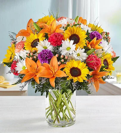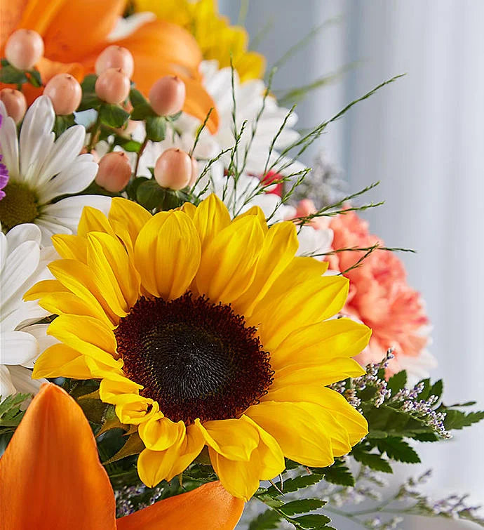 :1001-P-161767Make sure someone special has a bright, sunshine-y day! Our florists hand gather and arrange lilies, sunflowers, daisies, and much more in half a dozen different hues to create a birthday, anniversary, or get well gift designed to part the clouds and bring some light into the life of one you love!